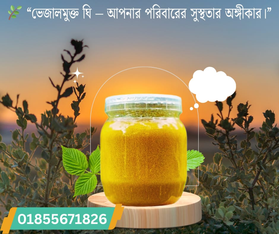 “বিশুদ্ধ দুধ থেকে তৈরি খাঁটি গাওয়া ঘি — কোনো কেমিক্যাল নয়, শুধু আসল স্বাদ আর ঘ্রাণে ভরপুর। শরীর ও ত্বকের যত্নে প্রতিদিনের খাবারে রাখুন আমাদের ঘি!”